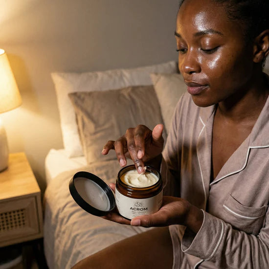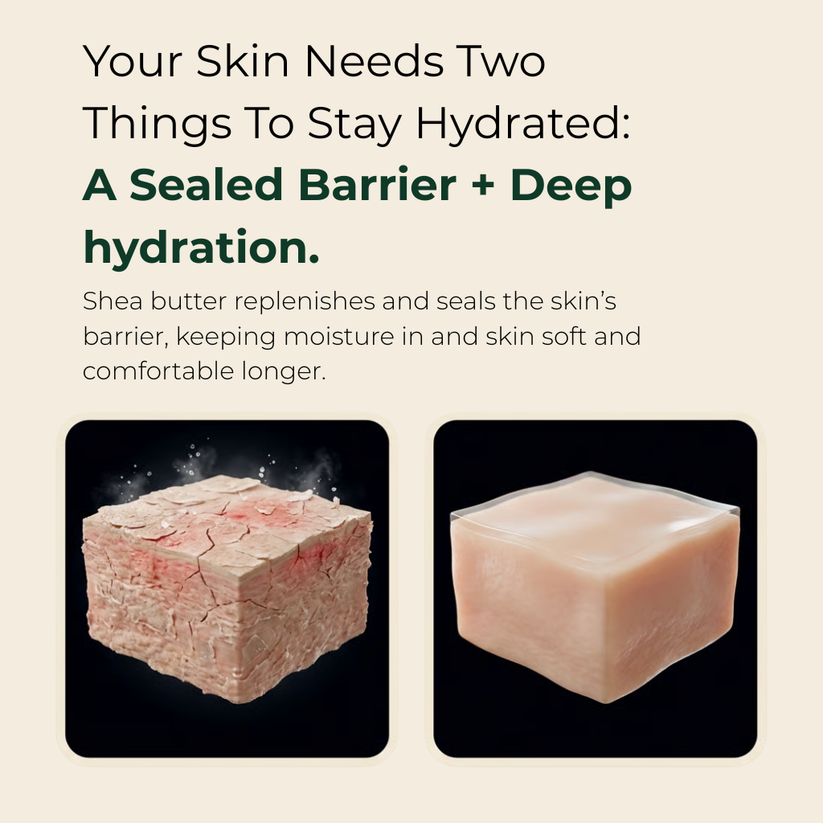 Raw unrefined shea butter works differently because it creates a protective comfort seal over your skin. The natural vitamins A, E, and F along with essential fatty acids don't just moisturize—they fill surface roughness and form a breathable barrier so moisture stays in. This helps calm irritation, cushion rough patches, and gives your skin the protection it needs to feel soft, supple and comfortable again.